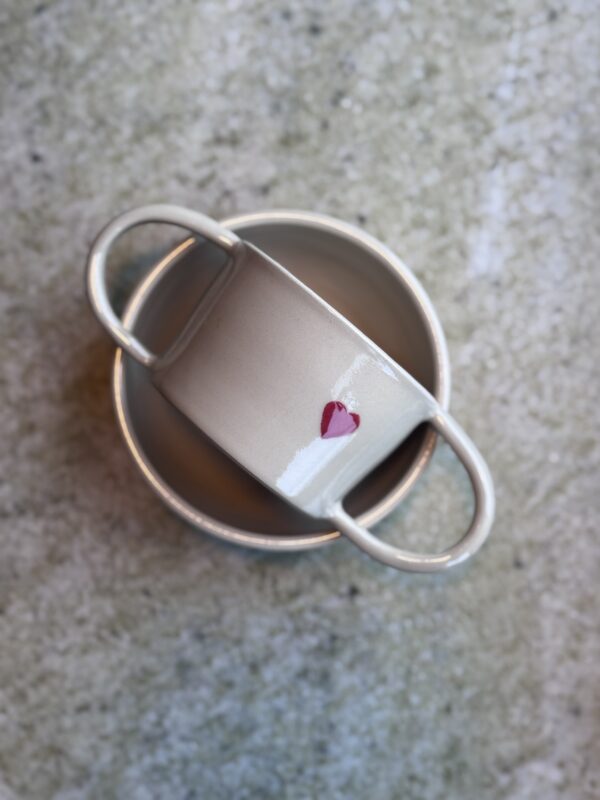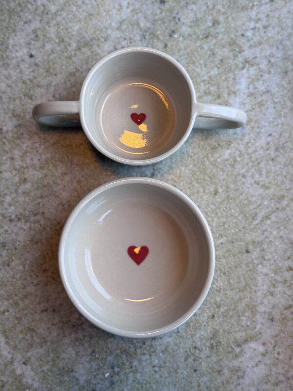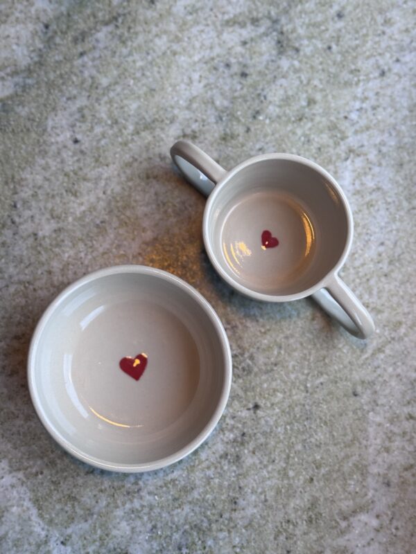 Litet set till barn med skål och greppvänlig mugg. Dekorerad med röda hjärtan. Rymmer: Skål 3dl, mugg 2dl Utförande: Vit lera med transparent glasyr